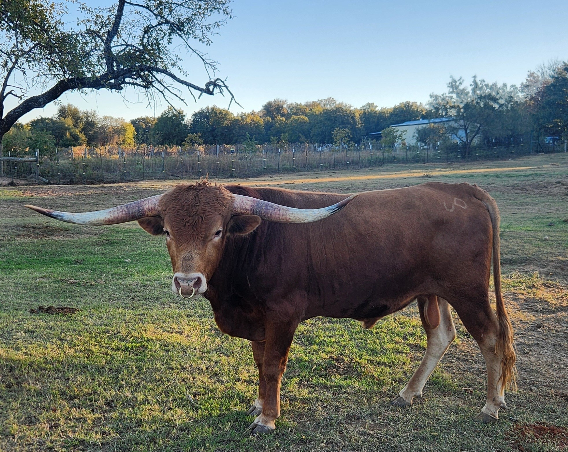 TW is our up and coming son of Savage Sam. With his impeccable horn pedigree and show confirmation we have great expectations for this young bull. He was 47" at the hip at 3 years old. We will be test breeding TW to a select few females this year for 2027 calves.